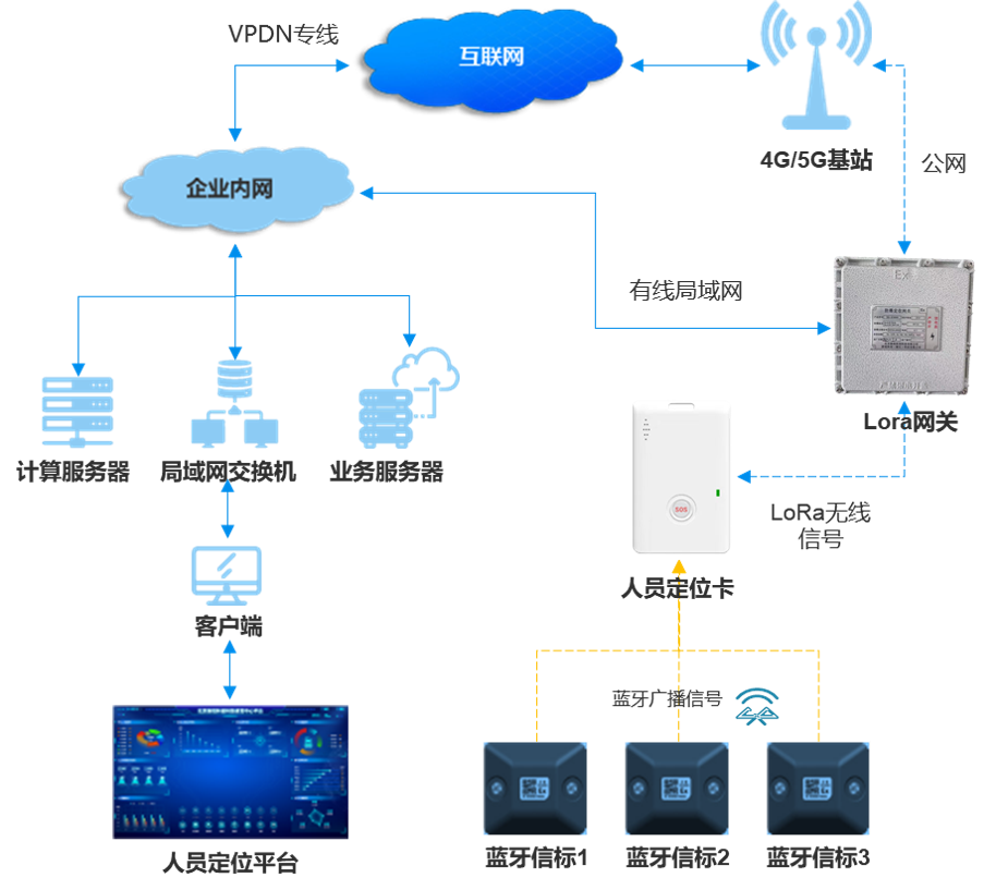 硬件包含低功耗藍牙信標、LoRa定位基站以及人員和車輛佩戴或搭載的定位終端。