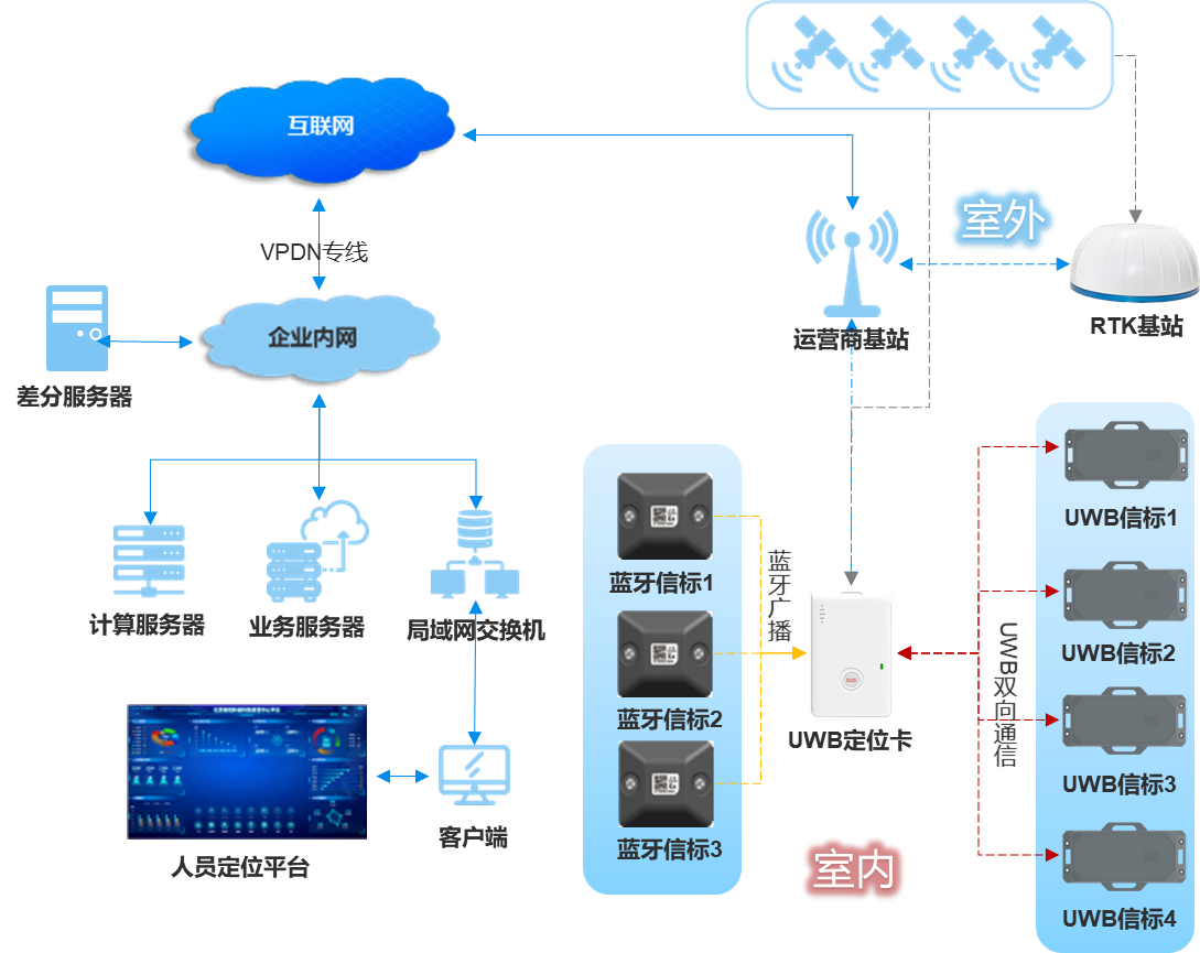 融合北斗RTK、UWB和藍牙技術(shù),實現(xiàn)了室內(nèi)外高精度定位。在室外,北斗RTK技術(shù)結(jié)合地面基準站的誤差修正機制,能夠為移動的人員與車輛提供高精度定位服務(wù);在室內(nèi),UWB技術(shù)通過測量信號飛行時間實現(xiàn)亞米級定位,藍牙信標則用于近距離精準定位與信息交互,滿足了高分子化工廠復(fù)雜環(huán)境下對人車定位精度的嚴格要求。