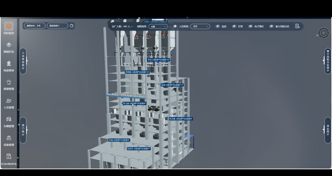 系統(tǒng)支持在工廠2D/3D電子地圖上實時顯示人員位置分布,可分樓層、分車間顯示;可對每個人的實時軌跡進行跟蹤,實現(xiàn)了對人員位置的實時追蹤和展示。