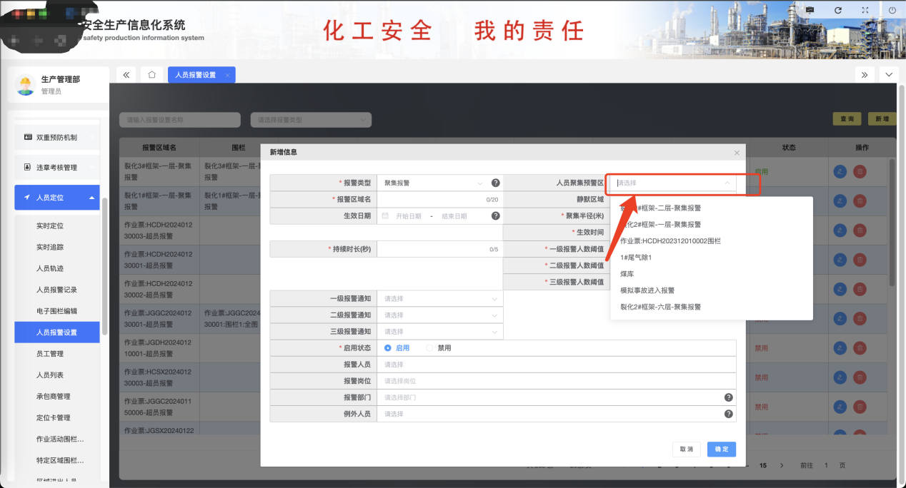 系統(tǒng)支持在廠區(qū)自定義設置電子圍欄范圍,設定圍欄生效時間、限定人數(shù),通過設定區(qū)域的進入權限管理規(guī)則,系統(tǒng)能夠確保人員只在安全范圍內活動,有效防止了違規(guī)進入危險區(qū)域的行為。